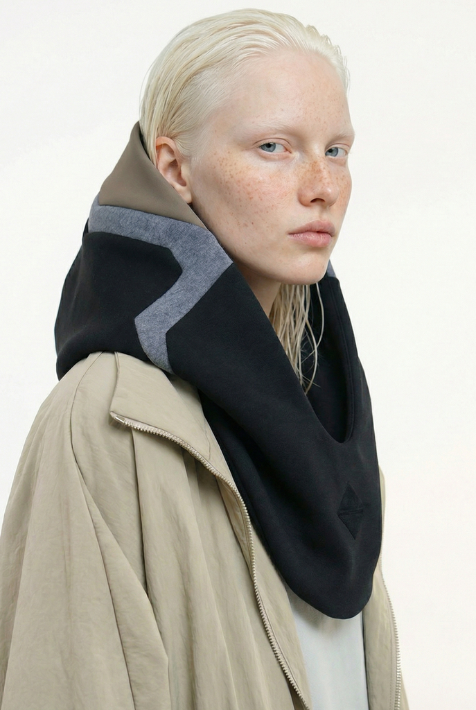 The grey insert runs through the hood like lightning, giving it its tough and sporty character. The hood is detachable and a unisex accessoire. It can be combined with every upper part. The look can be sporty and elegant. ONE SIZE